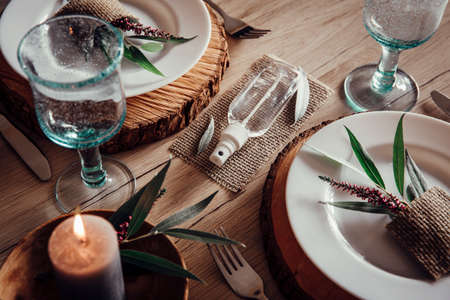 High angle view of festive table setting with fancy wine glass, plates, tableware and white orchid in flowerpot. Wooden and cozy house with vintage interior style