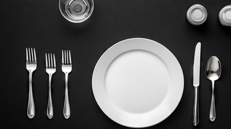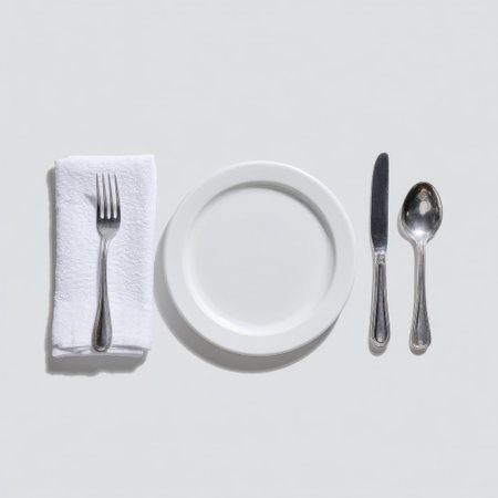 This image showcases an elegant dining setup featuring a fork, knife, spoon, white plate, and a neatly folded napkin on a clean surface, perfect for restaurants and culinary presentations.