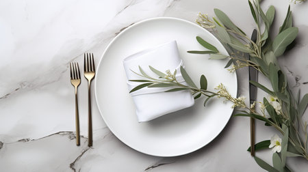 a festive summer wedding scene, focusing on a marble table setting with cutlery for one person, adorned with olive branches, white peony flowers, a ceramic plate, and a silk ribbon