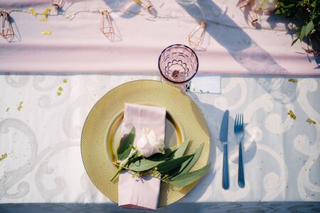 Gold plate with pink cloth napkin and olive leaves. Raspberry old glass glass. A floral arrangement in the center of the table.