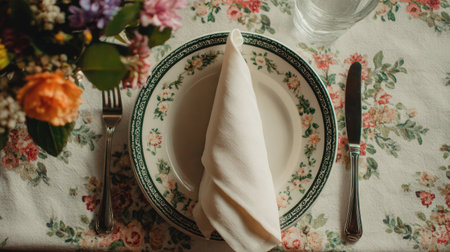 A beautifully arranged dining table featuring a folded napkin on a floral plate, elegant cutlery, a refreshing glass of water, and a lovely flower centerpiece.