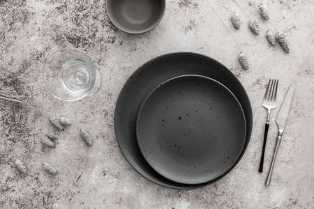 Dining table setting. Two gray plates with silver cutlery on the linen napkin. minimalist style.