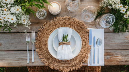 A beautifully arranged table features white plates, cutlery, and glasses on a rustic wooden surface, creating an inviting atmosphere for meals and gatherings.