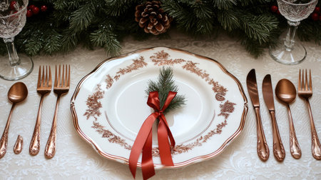 Christmas dinner setup with white porcelain, bronze cutlery, sprigs of pine, and soft red ribbons creating a warm holiday ambiance