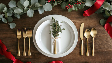 Holiday meal setup with white dinnerware, golden utensils, eucalyptus sprigs, and festive red ribbons on a rustic wood table