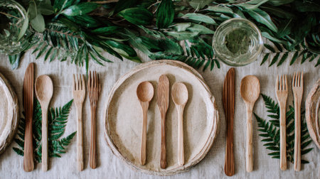 Discover a beautifully arranged table featuring wooden cutlery and leafy greens, perfect for an eco-friendly dining experience that emphasizes natural beauty and charm.