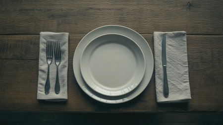 A sophisticated table setting featuring an empty plate, fork, knife, and soft linen napkins arranged neatly on a rustic wooden table, ideal for dining visuals.