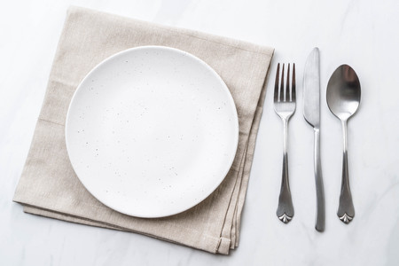An empty white ceramic plate with a fork and a table knife on a dark marble countertop, top view