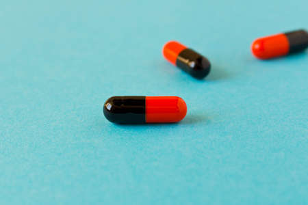 Medicine capsules lie in a heap on a blue background.