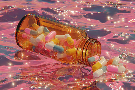 Colorful capsules are spilling from an amber bottle onto a shimmering surface, creating a lively and engaging scene filled with bright colors and reflections