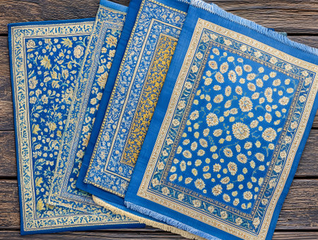 Stack of Blue and Gold Oriental Rugs Persian Carpet Design Decorative Home Textiles