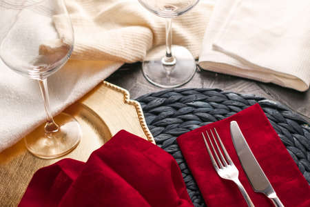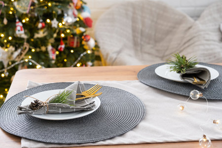 Serving a festive table with plates, forks, knives, napkins, glasses close-up in the modern interior of a loft house decorated for Christmas and New Year. Waiting for guests for a festive dinner