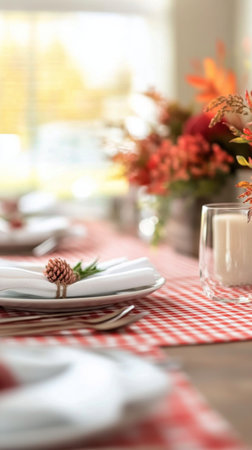 Wooden table with decorative napkins and red cups for tea. Dining room interior.