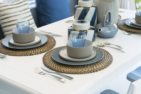 Top view of various dishware on the white dinner table - ceramic plates, cup, fork, spoon and knive