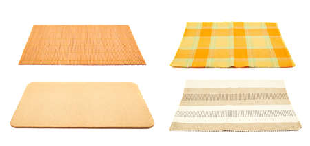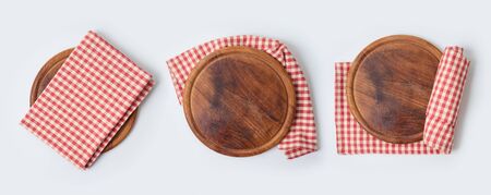 Round pizza board with red checked tablecloth collection on white background. Cooking or baking mock up for design. Top view from above