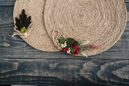 Cozy rustic woven placemat on wooden table with natural decor elements. That the image is generated using AI.