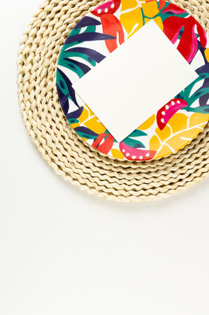 Top view of brown wicker table mat, white card, colorful plate on white background. Straw round tray, exotic plant plate, summer picnic. Flat lay, copy space.