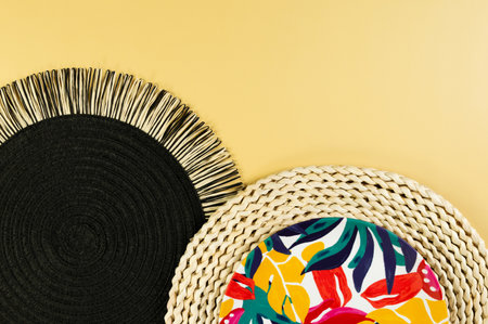 Top view of brown wicker table mat, black tray, colorful plate on yellow background. Straw round tray, exotic plant plate, summer picnic. Flat lay, copy space.
