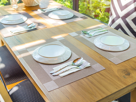 White plates with stainless steel spoons and forks on the plate mats on wooden table.