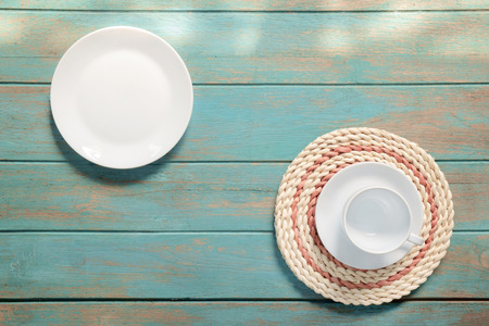 White plate and coffee cup on old wood background. Top view. Flat lay.