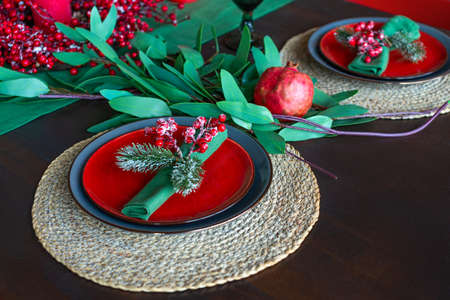 Stylish Christmas design with green napkin decorated with a sprig with berries and fir branch, red plates on wooden table. Xmas or New Year Concept. A table set for a holiday meal.