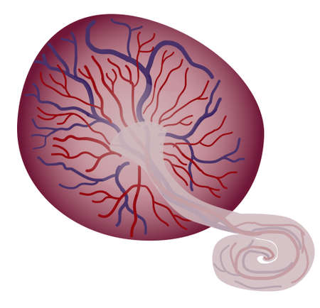 Placenta and Umbilical Cord of newly born baby. organ attached to the lining of womb during pregnancy. Structure. veins and arteries. Colored vector illustration