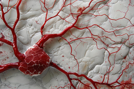 Detailed model of red blood vessels and heart on a textured white cracked background, depicting the circulatory system