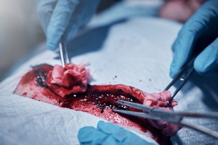 Hands, blood and operation with a team of doctors at work during surgery with equipment or a tool in a hospital. Doctor, nurse and collaboration with a medicine professional group saving a life