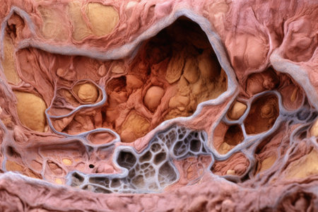 a model of the human body showcasing intricate details with a mix of small and large cells. the model is designed in a captivating dark orange and gold color scheme. created using octane render and zeiss batis 18mm f28 lens, this artwork features detailed character illustrations, medical themes, swirling vortexes, and dusty piles. ai generated