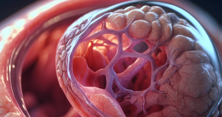 The inner structures of the human heart in detail, highlighting anatomical features and textures in a medical context.
