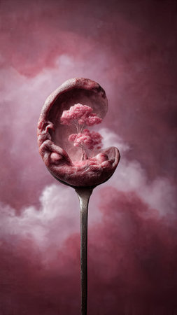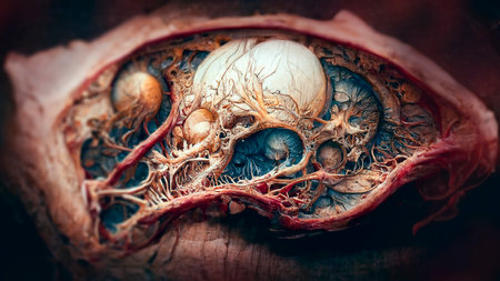 a close-up photo of a highly detailed organ, resembling a zbrush creation. the organ showcases vibrant red cells, while the intricate anatomy is captured with the zeiss batis 18mm f2.8 lens. rendered in maya, the photo features a unique squiggly line style, with texture-rich compositions and mesmerizing swirling vortexes. ai generated