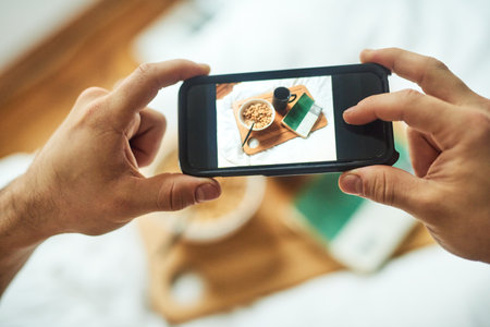 Hands of male blogger photographing mushroom soup through smart phone at a cafe