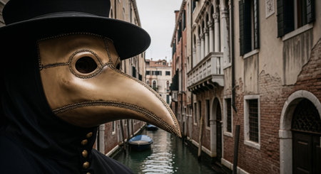 Mysterious plague doctor figure in ornate golden mask and black hat positioned above Venice canal. Historic Italian waterway with gondola, brick buildings perfect for travel, history, mystery themes.