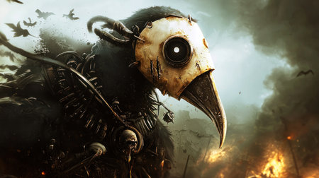 A close-up of a dark, ominous figure wearing a bird-like plague doctor mask, featuring a long beak and glowing eyes, evoking a sense of dread and mystery.