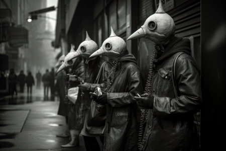 Plague doctor, pestilence contagion epidemic, middle age, bubonic fever, black death, protective suit, dangerous disease.
