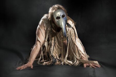 Half-naked man with long hair in medieval rags and a plague mask on a black background
