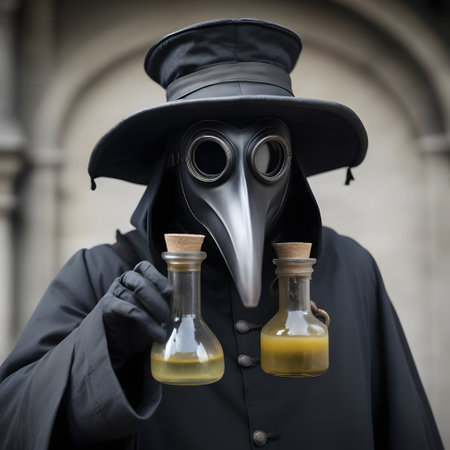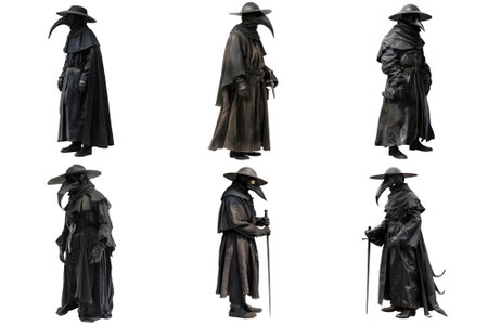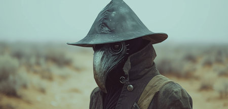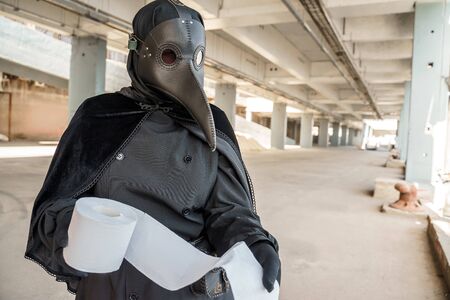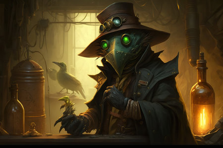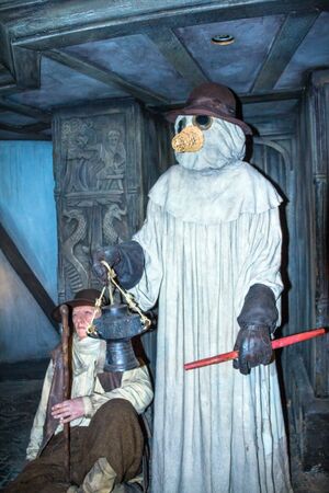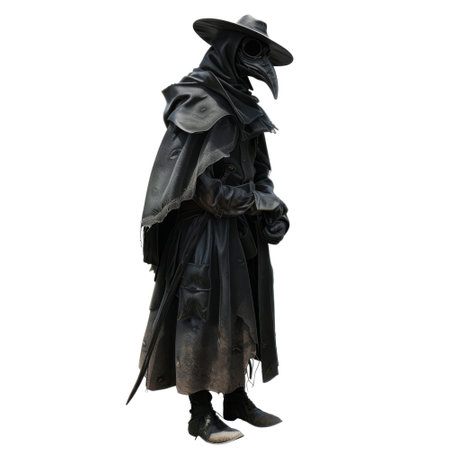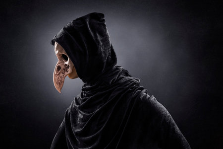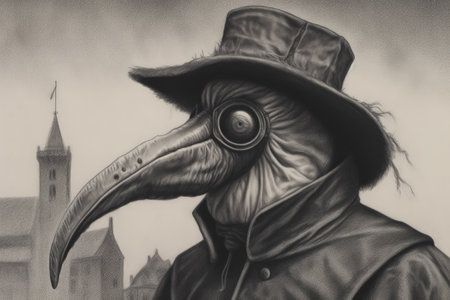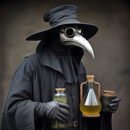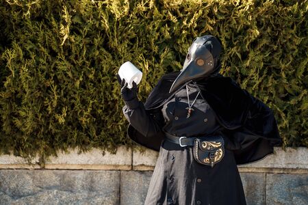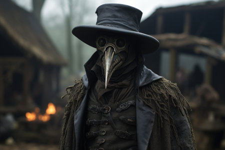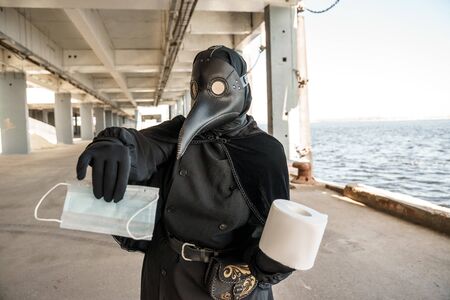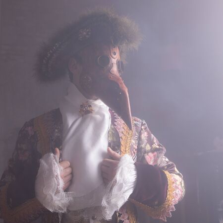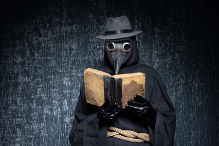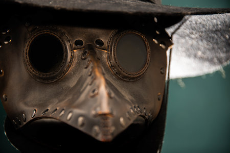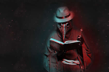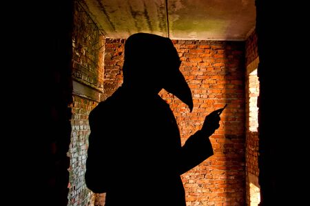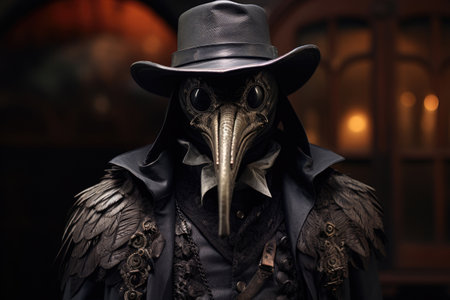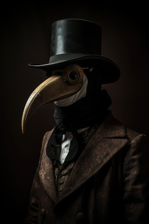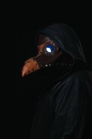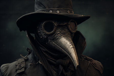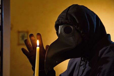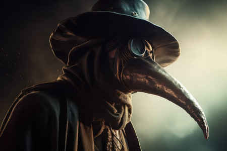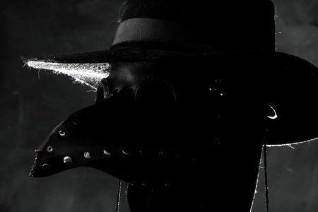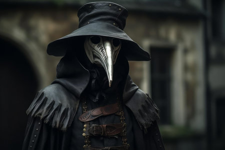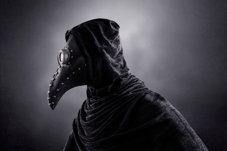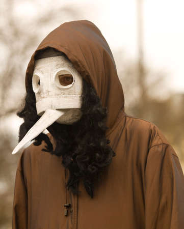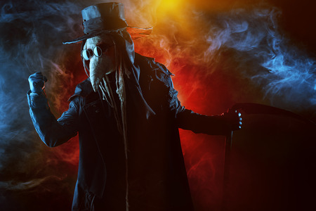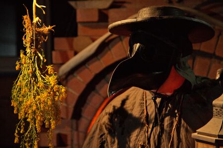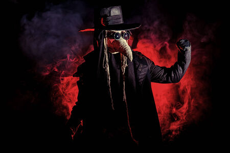 Plague doctor, pestilence contagion epidemic, middle age, bubonic fever, black death, protective suit, dangerous disease.