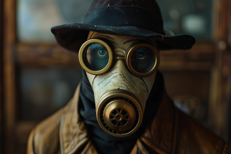 Eerie plague doctor sits pensively at a wooden desk under the glow of a desk lamp