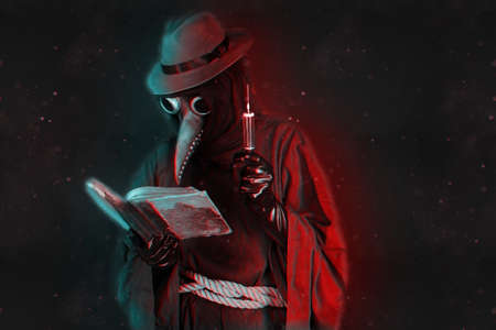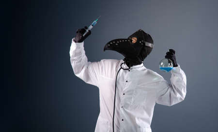 doctor in a dressing gown, in a plague doctors mask, is vaccinating
