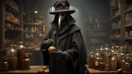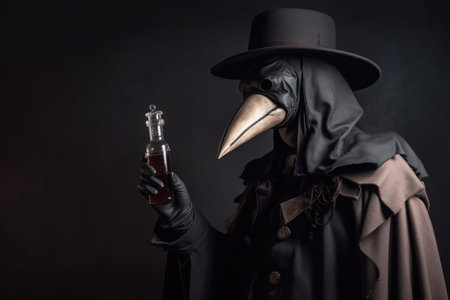 The plague doctor holds a medicine in his hand. Generative AI illustration