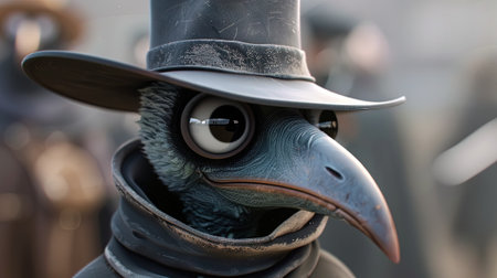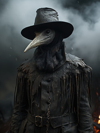 A figure dressed in a dark cloak and a bird like mask stands still holding red gloved hands together evoking a sense of mystery and history.
