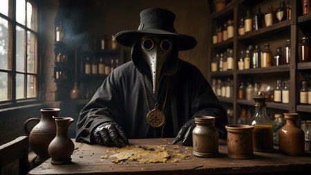 Plague doctor in the pharmacy with beak mask and lots of medicines