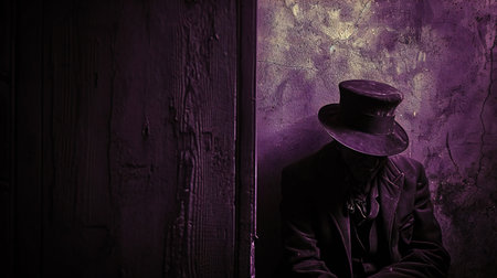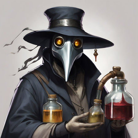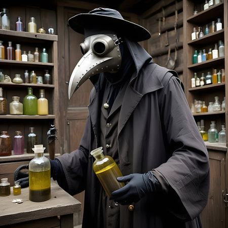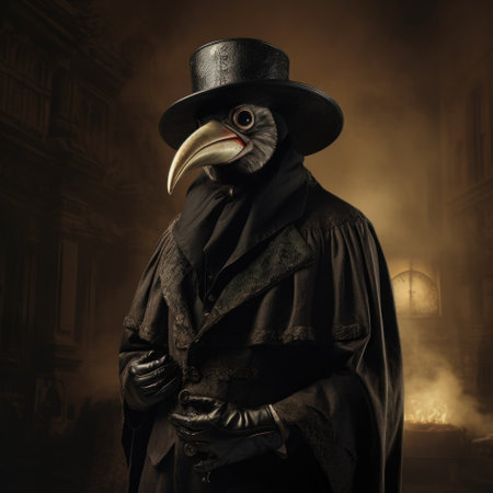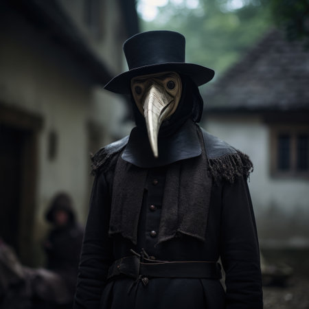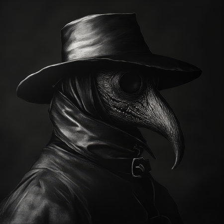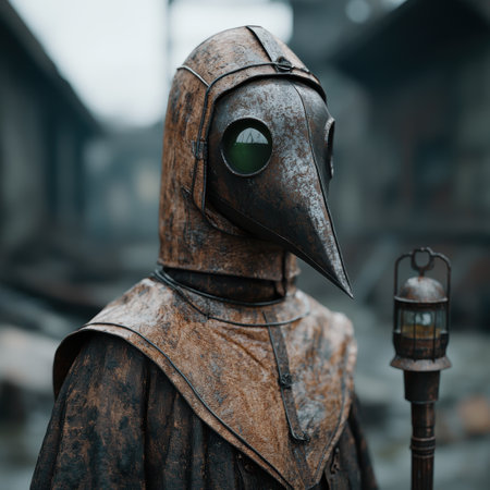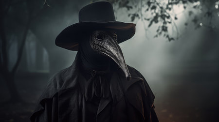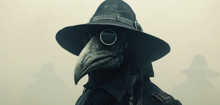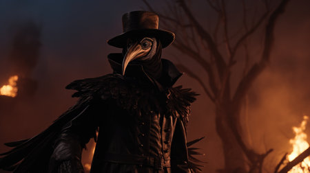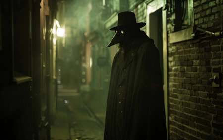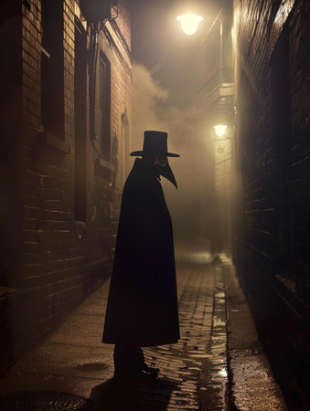 A ominous figure in plague doctor costume stands in a misty, dimly lit alleyway, evoking a sense of mystery and historical drama.