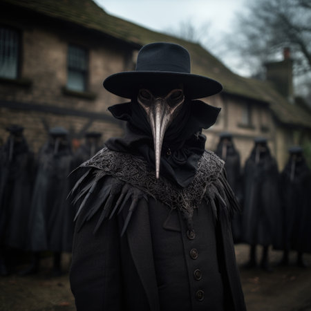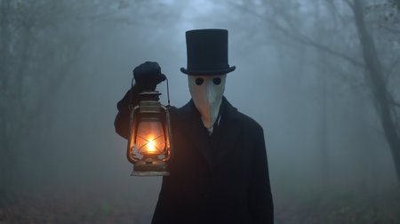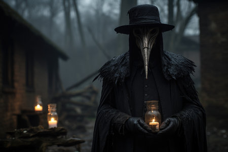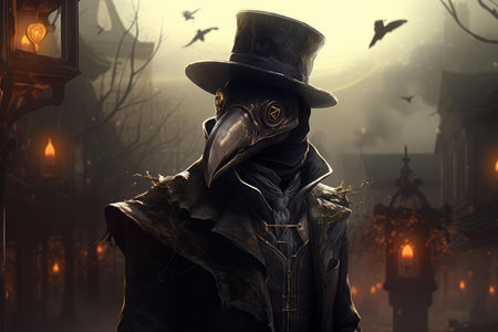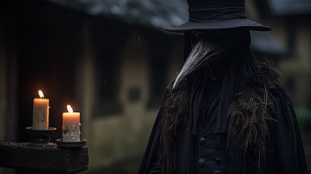 Plague doctor wearing a mask and holding a lantern is walking through a medieval town during an outbreak of bubonic plague