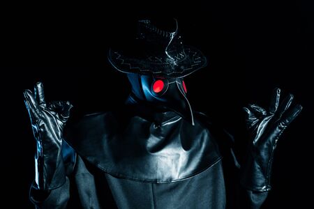 Plague doctor with crow-like mask isolated on black background Creepy halloween historical terrible costume concept Epidemic covid smallpox monkeypox