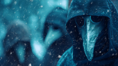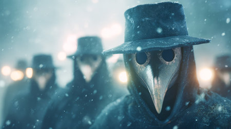 Plague doctors in snowstorm with eerie atmosphere. Generative AI