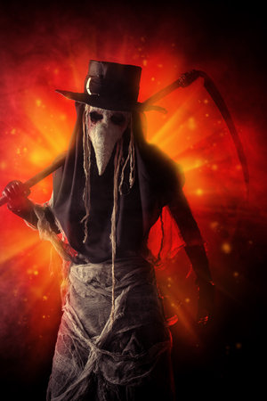 Portrait of a terrible plague doctor with a scythe. Medieval Europe. Halloween.