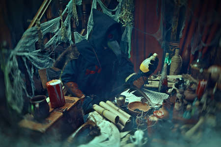 The plague doctor is working at his desk, inventing a cure for bubonic plague. The atmosphere of mysticism. Historical reenactment. Halloween.