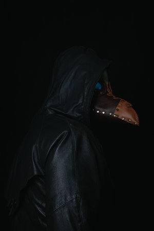 Portrait of plague doctor with crow-like mask isolated on black background. Creepy mask, halloween, historical terrible costume concept. Epidemic