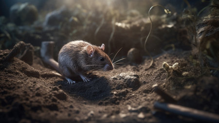 a rat in the mud, with a strong facial expression, gazes out into the open space. this backlit photograph captures the intensity of the moment, showcasing the rat's shiny eyes. shot in 8k resolution, the image highlights the intricate details of the traditional vietnamese setting. the photo is enhanced by the powerful combination of intel core and rtx technology. ai generated